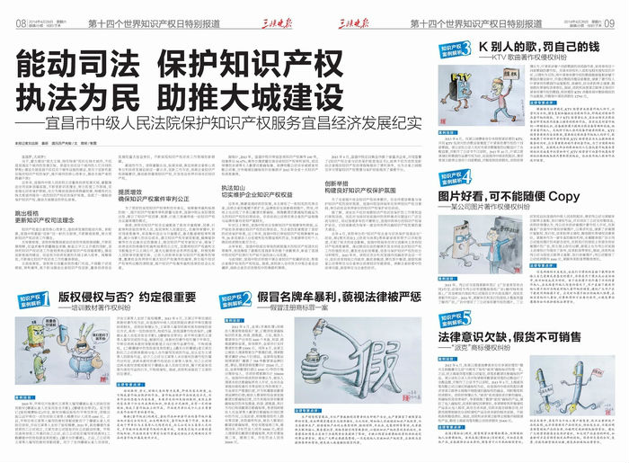 宜昌市中级人民法院自2009年4月,每年的世界知识产权保护日即将到来之际,都会采取举办知识产权企业和司法保护座谈会、知识产权企业与司法保护宜昌论坛、知识产权案件发布会等形式,组织企事业单位、市知识产权局等知识产权行政执法部门、宜昌市法学会、中南财经政法大学专门人士以及三峡大学法学院等单位的代表进行座谈交流。今年,除召开企业家座谈会外,该院进一步加大宣传力度。4月24日中央政法委、中国法学会刊物《民主与法制时报》头版刊发《知识产权的宜昌样本》文章,用4000字文章介绍宜昌中院知识产权案件审理“三合一”制度以及知识产权司法保护工作的突出成绩。4月26日,《三峡晚报》开辟专版,发布2013年度宜昌中院知识产权案件,报道知识产权司法保护工作。据悉,4月以来,《楚天法治》、《三峡日报》以及湖北荆楚网等多家媒体先后对该院知识产权司法保护经验的主题进行约稿宣传报道。
