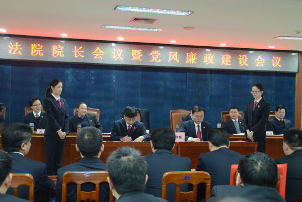 3月13日上午,宜昌中院召开全市法院院长会议暨党风廉政建设会议。会上,宜昌中院党组书记、院长张忠斌分别与各基层法院及神农架林区法院院长签订了2015年度党风廉政建设责任书,明确了各基层法院及神农架林区法院抓党风廉政建设的责任范围和承担责任的方式。