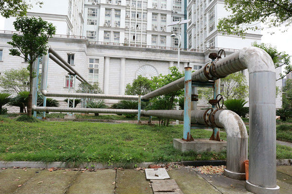 3、宜昌中院空调采用循环水加热的方式,通过地下440根水热管保持水温,输送暖气至全院各办公室。无需频繁启动,在保持水温的状态下只需加热即可达到效果,有效节电节能。图为外部输送管道。