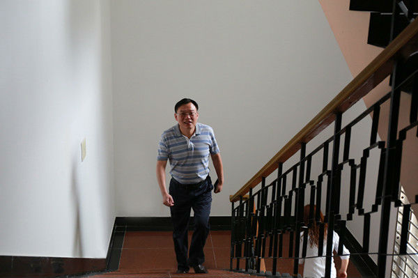 4、6月15日全国低碳日当天早上,宜昌中院关闭电梯两小时,法院干警200余人步行上楼。图为法院领导以身作则,率先走上楼梯。