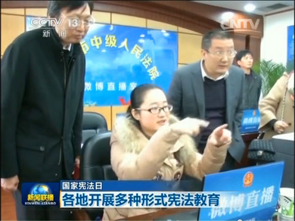 上周,宜昌中院成功举行国家宪法日法院开放活动。当晚,活动现场画面就出现在了中央电视台《新闻联播》国家宪法日活动的新闻播报中。同时,湖北电视台《湖北新闻联播》,宜昌三峡电视台《宜昌新闻》、《直播宜昌》均对宜昌中院活动进行了报道。