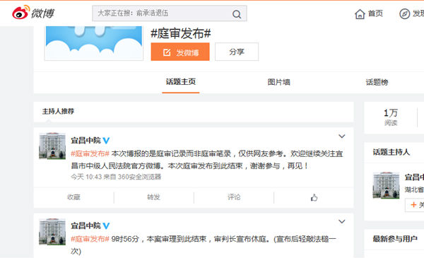此次庭审共持续约一个小时,宜昌中院新浪官方微博(宜昌中院V)共发布微博信息13条。