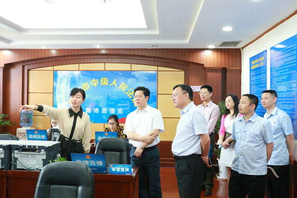 在微博直播室,李群星副院长听取了法院干警介绍的微博发布流程,详细询问了微博发布的时间和间隔长短,并对微博发布时间的把握和微博维护等具体细节提出了指导性意见。